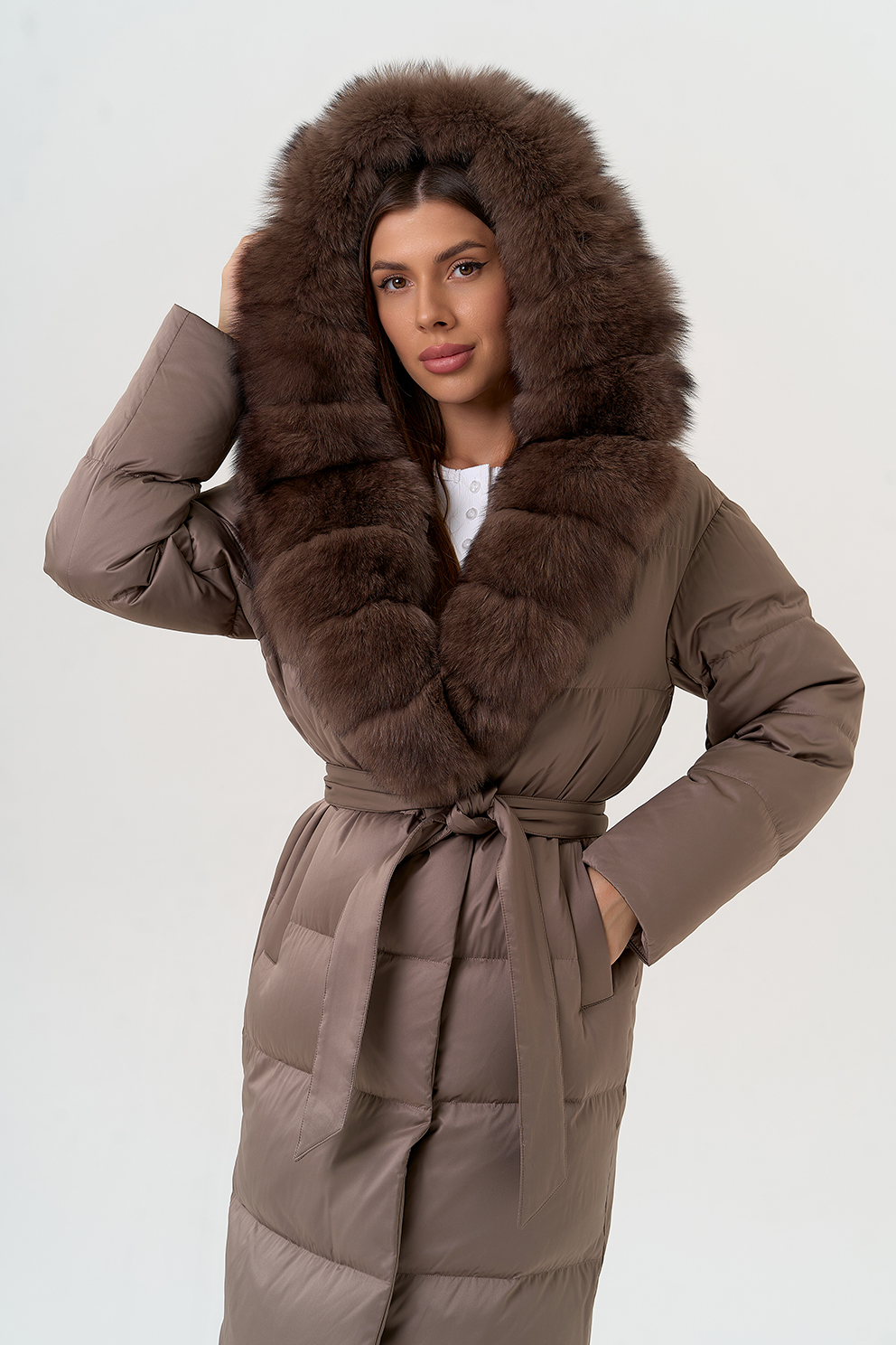Крой воротника - капюшон, отделка мех песца